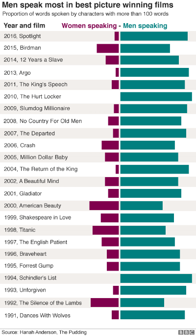 According to a study by the Geena Davis Institute on Gender in Media, the canary is on life support. They found that in over 25 years of films winning the Academy Award for Best Picture, only 29.2% of 5,554 speaking characters were female — the same 3 to 1 male/female ratio that existed in 1946.